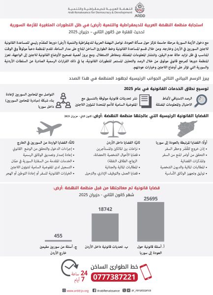 مع دخول الأزمة السورية مرحلة محورية جديدة تتسم بالحوارات حول العودة، تواصل منظمة النهضة العربية للديمقراطية والتنمية (أرض) أداء دورها الحيوي في تقديم المساعدة القانونية للاجئين السوريين في الأردن وخارجها. ومن خلال دائرة المساعدة القانونية وخط الطوارئ الساخن المتاح على مدار الساعة، تقدم النهضة (أرض) دعمًا قانونيًا موثوقًا وفي الوقت المناسب ويمكن الوصول إليه بسهولة، في ظل بيئة تتسم بتزايد حالة عدم اليقين وانتشار المعلومات المضللة وتجدد مخاطر الاستغلال.